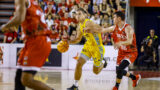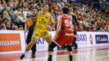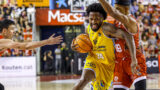 • Jugador del Club Baloncesto Gran Canaria avanza con el balón, defendido por un rival.