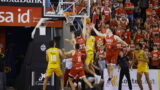 • Jugador del Gran Canaria celebra en la cancha, con público animando de fondo.