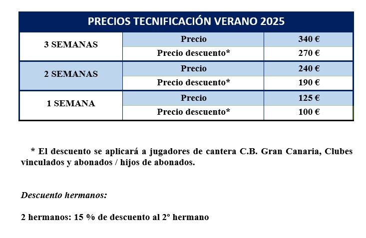 El Club Baloncesto Gran Canaria ya trabaja para que todos los jugadores y jugadoras federados de la isla puedan aprovechar el período estival para mejorar su juego. La Tecnificación de verano del club tendrá lugar del 7 al 25 de julio en el Pabellón Insular de La Vega de San José, de 10:00h a 12:30h de la mañana. Este programa estará comprendido en tres semanas diferentes. La primera de ellas será del 07/07/2025 al 11/07/2025, la segunda del 14/07/2025 al 18/07/2025 y la tercera del 21/07/2025 al 25/07/2025.
