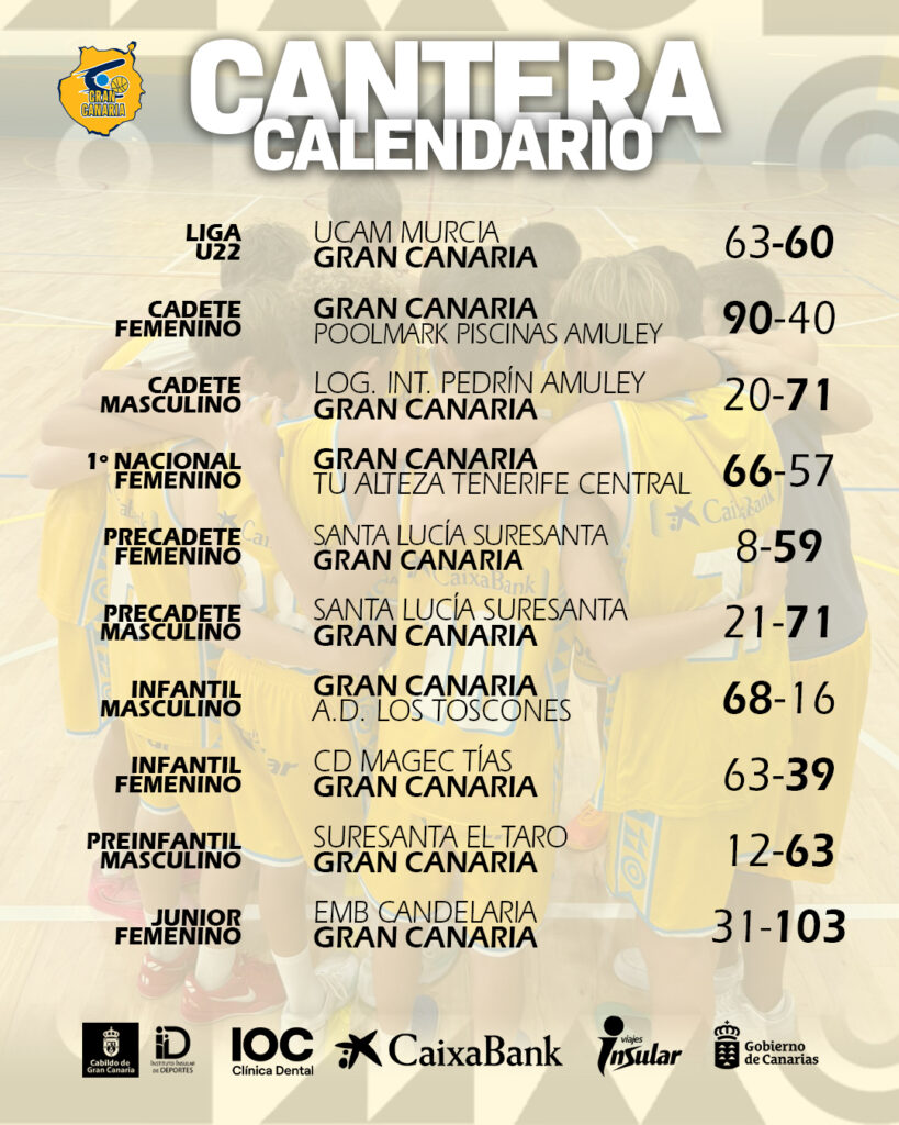 El U22 abrió el fin de semana con su visita al UCAM Murcia. Tras un partido de máxima igualdad en el que el cuadro de Ermis Papakonstantinou tuvo que remar contra viendo y marea, el resultado final fue de 63-60 para los murcianos. Por otro lado, el Gran Canaria ULPGC volvió a ganar. Las amarillas vencieron a Tu Alteza Tenerife Central por 66-57 en un emocionante partido en La Vega de San José. Así mismo, los equipos cadete también cumplieron. El masculino ganó a Logística Integral Pedrín Amuley por 20-71 y el femenino consiguió un triunfo de enorme nivel ante Poolmark Piscinas Amuley por 90-40.