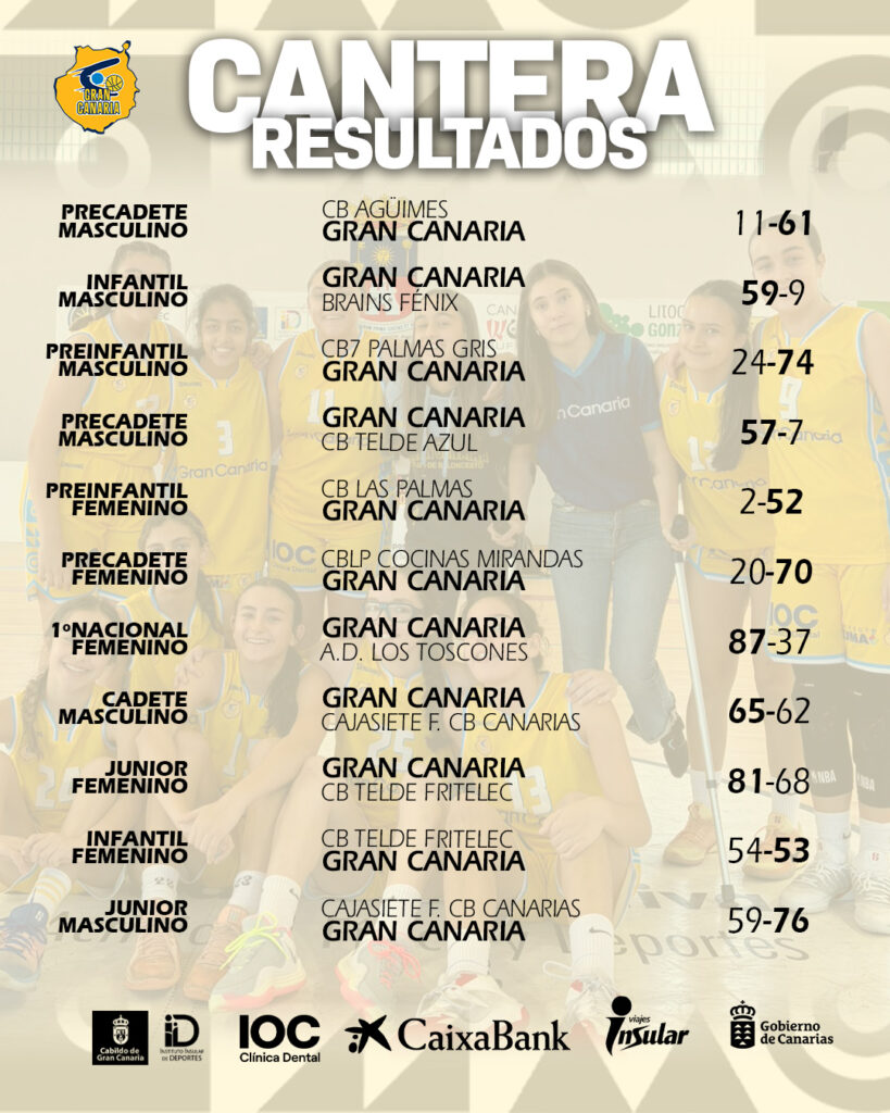 El domingo, a las 10:00h, el infantil femenino cayó por 54-53 en un ajustado partido contra CB Telde Fritelec y el junior femenino venció, también en su partido contra el CB Telde Fritelec, por 81-68. Por último, el junior masculino viajaba hasta la isla vecina para afrontar también un duro desafió ante el Cajasiete F. CB Canarias. Los amarillos cuajaron un gran encuentro a nivel colectivo y se hicieron con el triunfo en La Laguna por 59-76.
